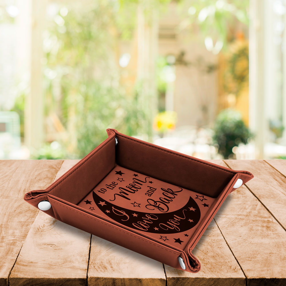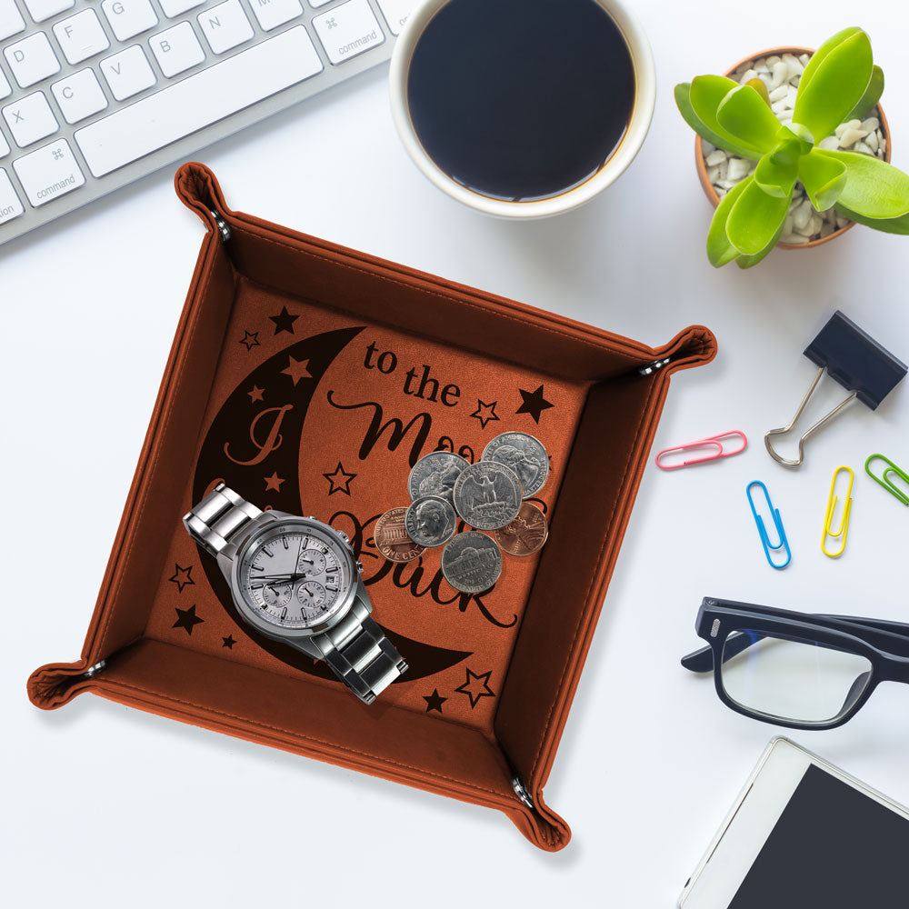 The "I Love You to the Moon and Back" Leather Tray is a heartfelt gift suitable for various occasions. Crafted from genuine leather, it showcases a charming inscription that captures love and commitment. It offers a secure space to hold keys, jewelry, or small trinkets. The rich brown color and elegant design make it a stylish addition to any space. Whether it's your 3rd wedding anniversary, 3 years as husband and wife, or occasions like Christmas, birthdays, or Valentine's Day, this tray conveys sentimentality and functionality. It's a perfect gift for her, him, or couples, serving as a daily reminder of love and organization. With its enduring message and timeless appeal, it is sure to be cherished for years to come.